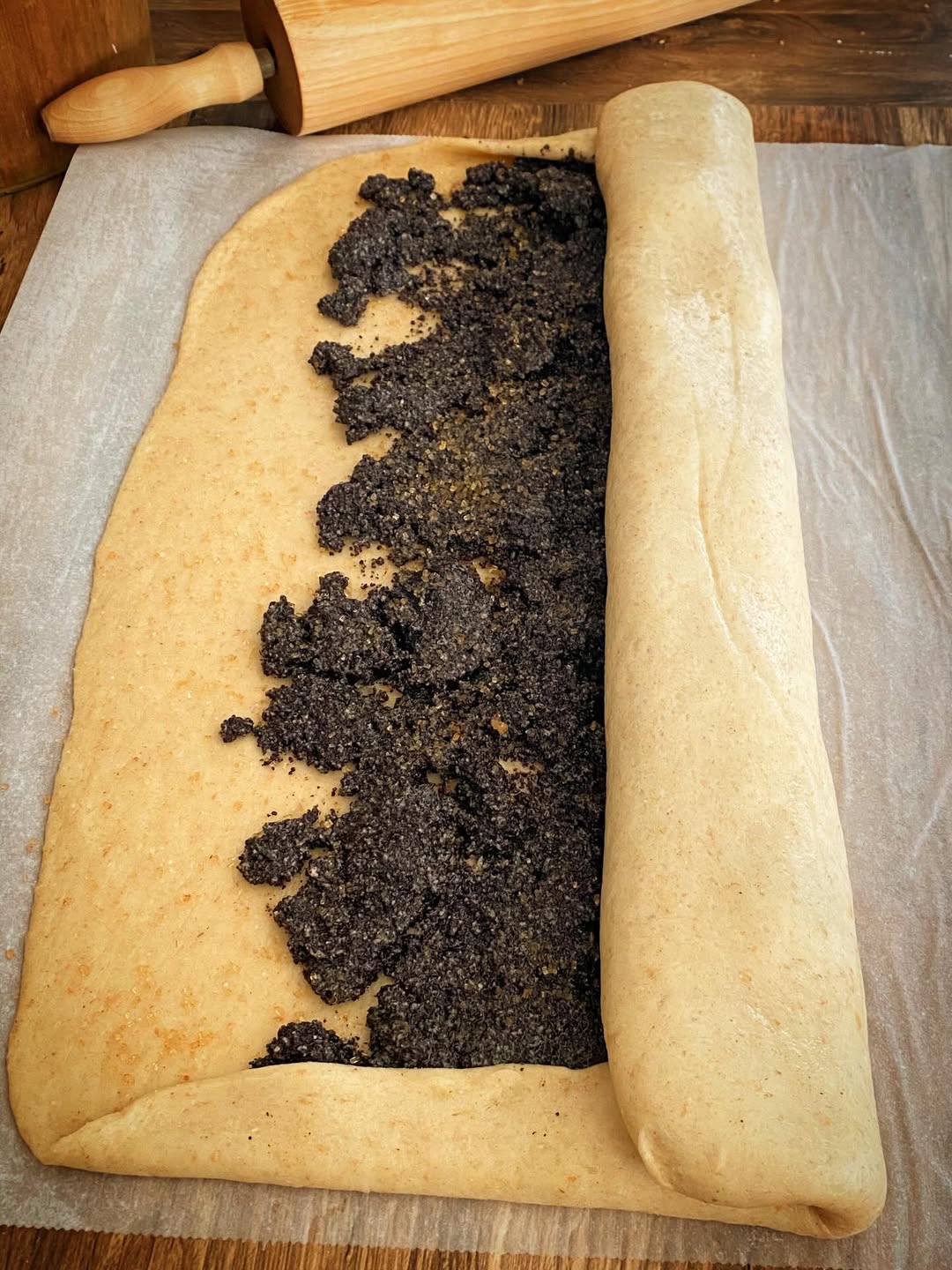- Tvarovanie:Vykysnuté cesto rozvaľkaj na papieri na pečenie (jemne potretom olejom).Natri makovú náplň, rovnomerne rozlož slivky a pomocou papiera zroluj.