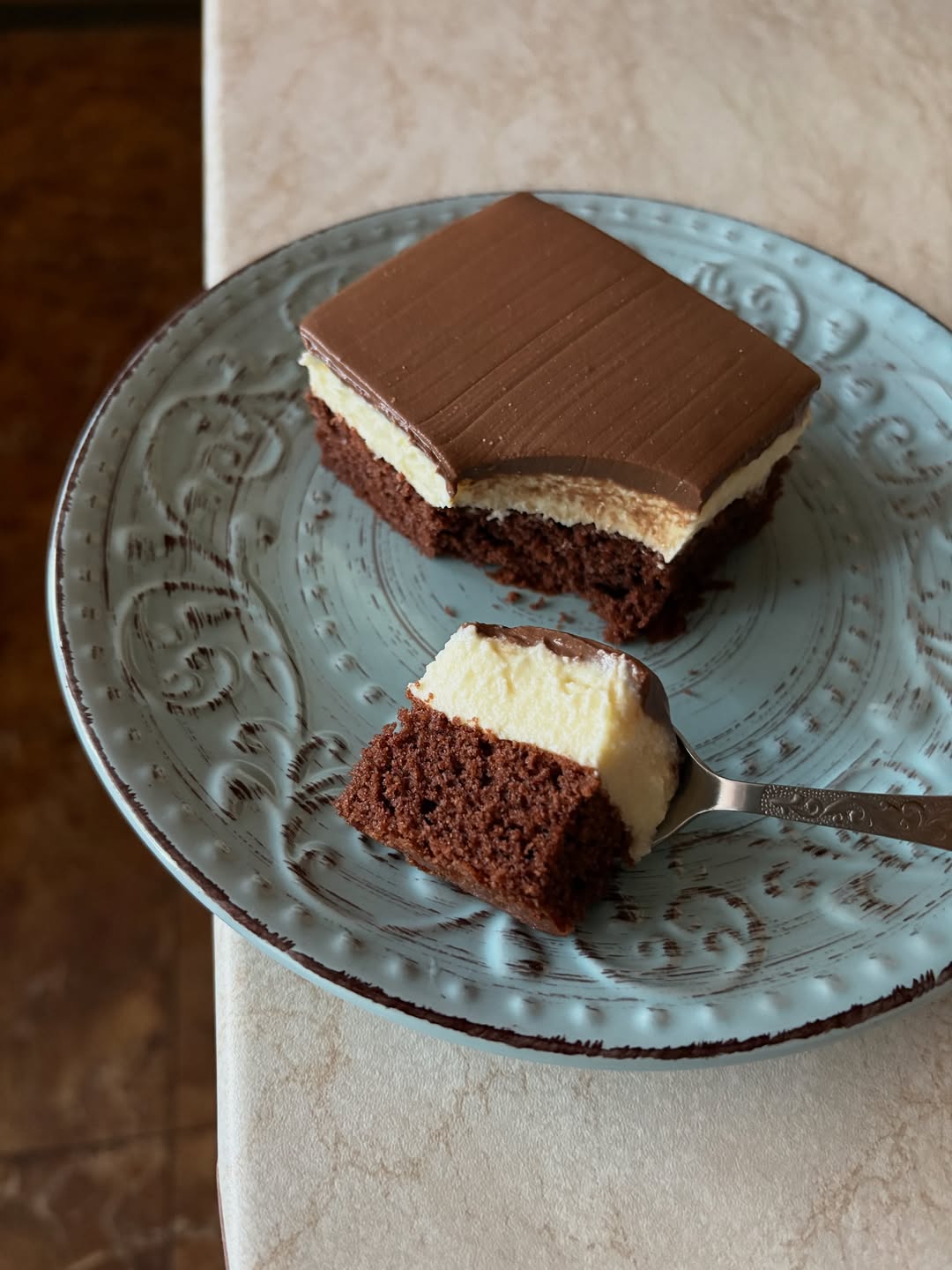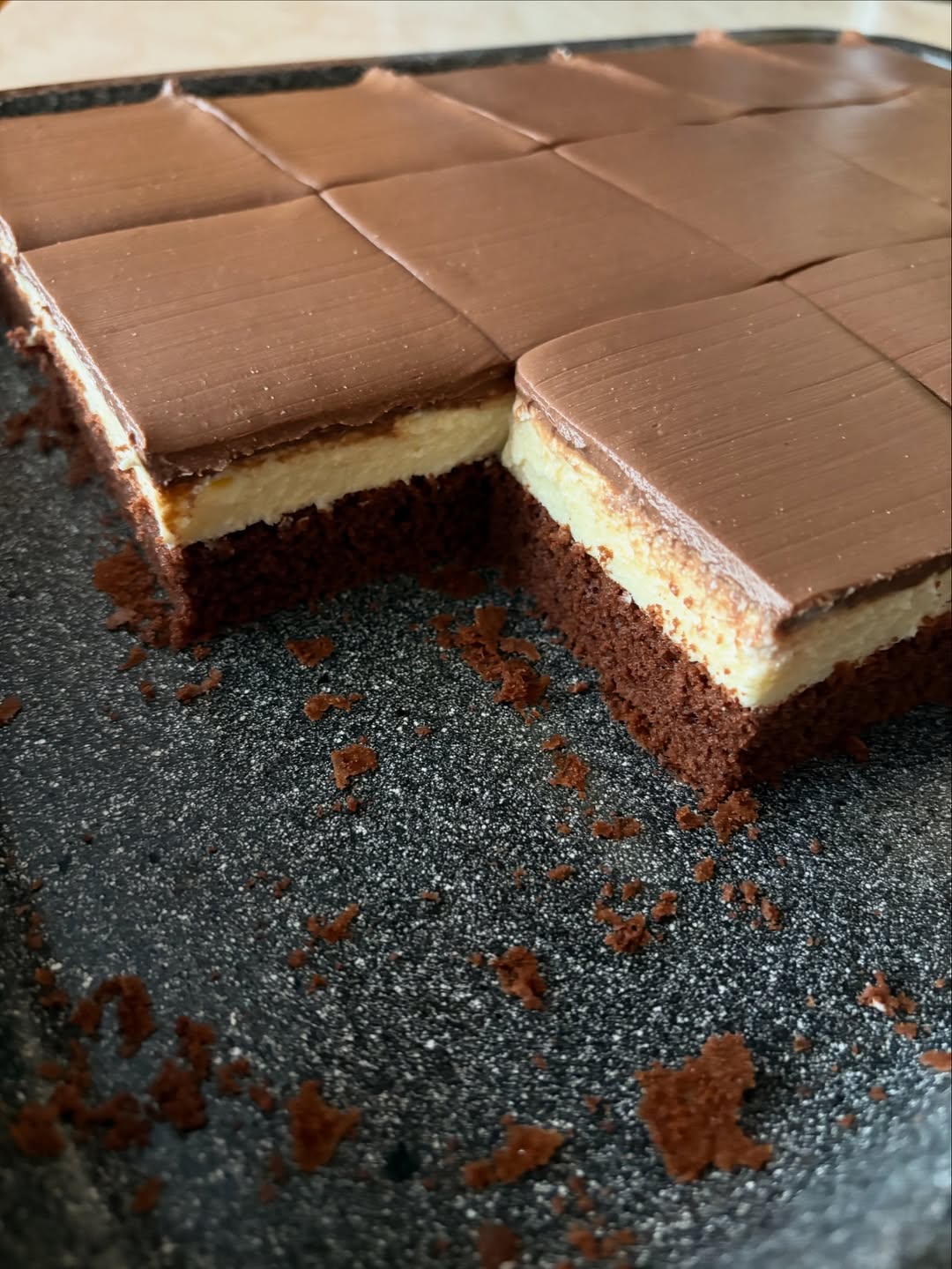 ✨ Nakrájame a podávame vychladené. Výsledok? Jemný, vláčny a čokoládovo-tvarohový sen!